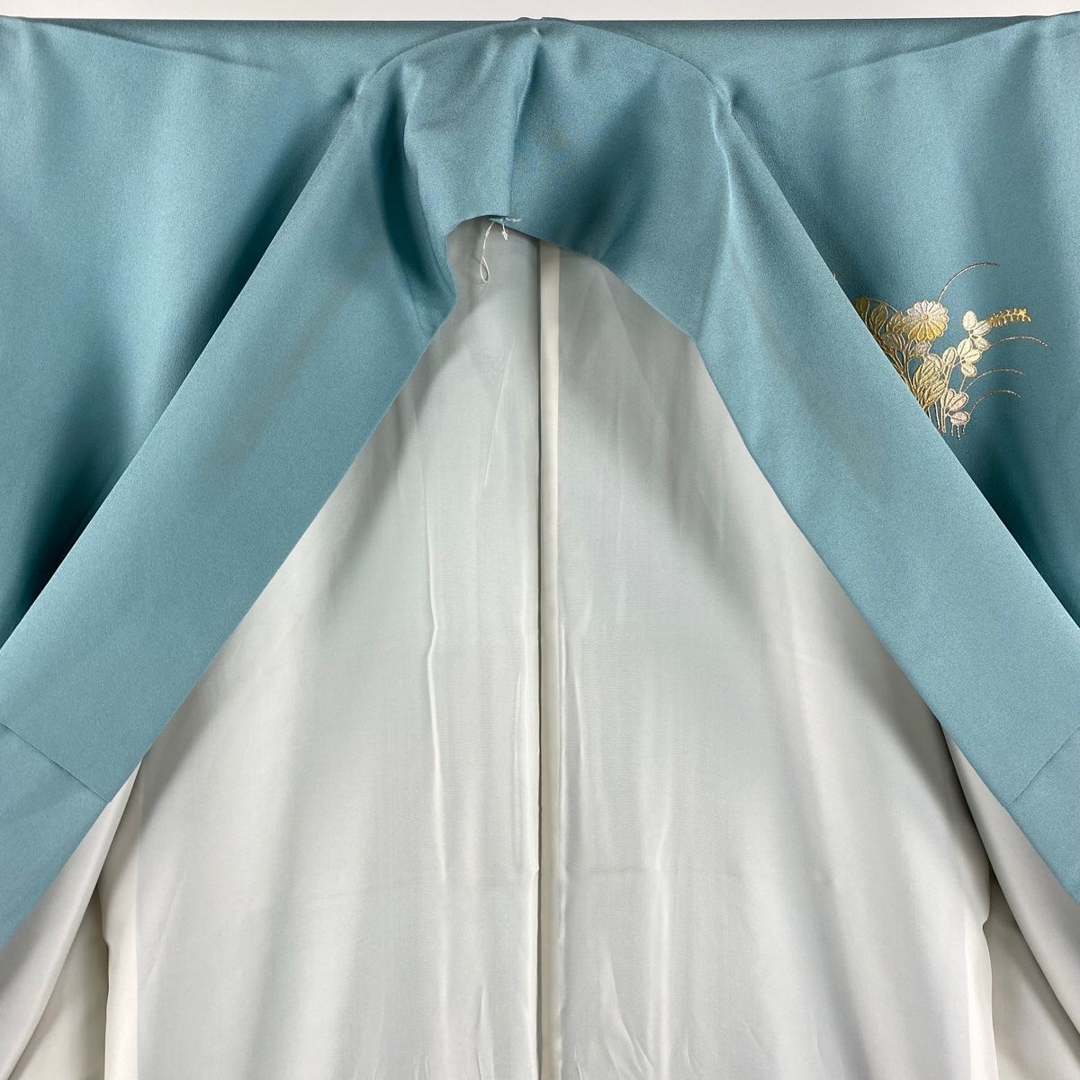 付下げ 身丈156 cm 裄丈64 M 袷 和田光正 落款 御所車 草花 金銀彩 染め分け 青灰色 正絹