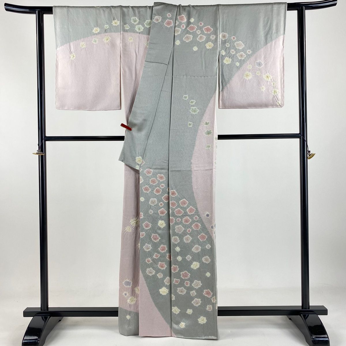 訪問着 身丈163 cm 裄丈64.5 M 袷 奇翠 青柳 落款 梅 楓 金彩 絞り 灰色 正絹