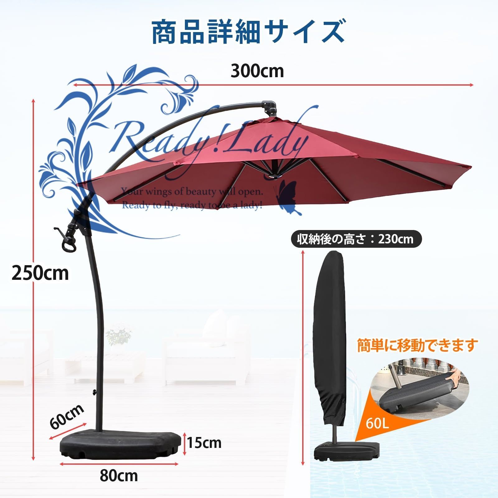 大型ガーデンパラソル 直径300 cm UVカット 撥水 風に強いアルミ製ハンギングパラソル 日除け傘カバー&水タンクベース付き 庭園 中庭 テラス用