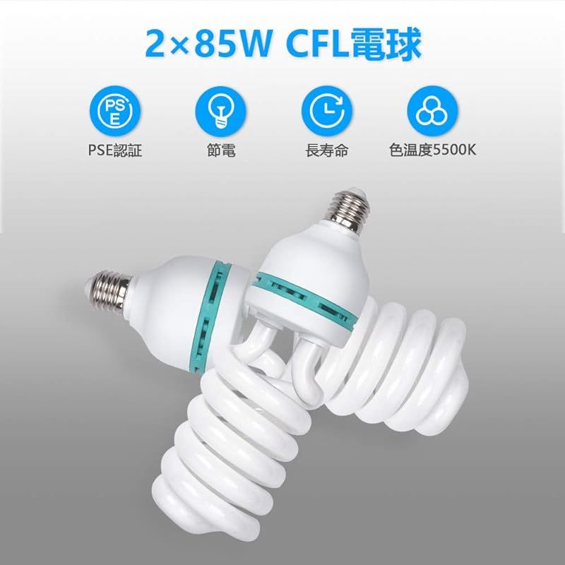 【省エネの撮影用照明、自宅スタジオを実現】高輝度かつ長寿命の85W、5500K(日本規格)純白CFL電球が2個配置され、最大80%のエネルギーを節約。高温に耐えるの為、電球が連続的に点灯の場合でも、電球が異常に熱が出たり、ソフトボックスが不快な臭いを放出したりはしません。 5500Kの色温度は日光に近く、連続した均一な光を生成し、人物はもちろん背景までハッキリと写してくれて、良好な写真環境を提供できる写真撮影照明セットです。