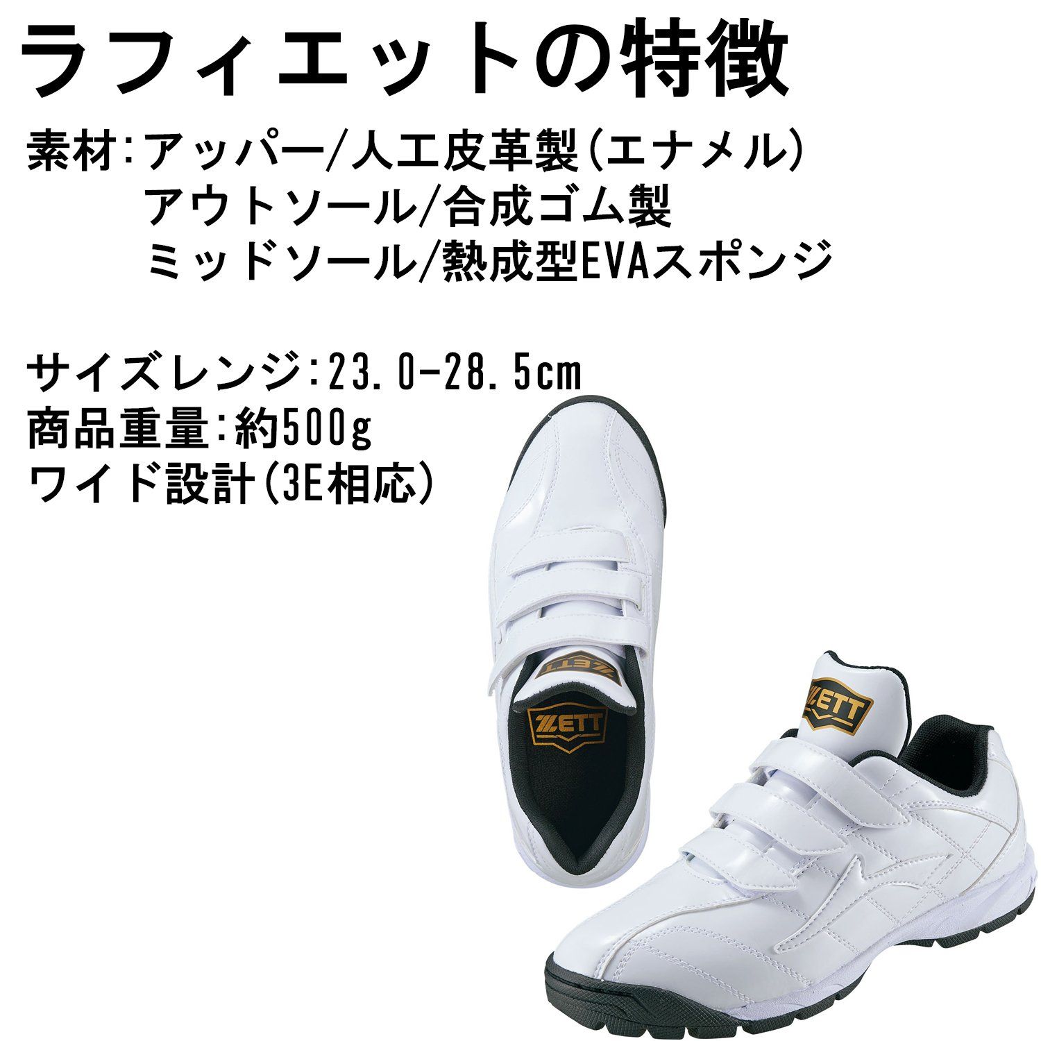 素材:アッパー本体/人工皮革製(エナメル)、補強/人工皮革製(エナメル)、アウトソール/合成ゴム製、ミッドソール/熱成型EVAスポンジサイズレンジ:23.0-28.5cm商品重量:約500g機能:屋外の土のグランドでも滑りにくいマルチスタッドタイプのアウトソール原産国:中国