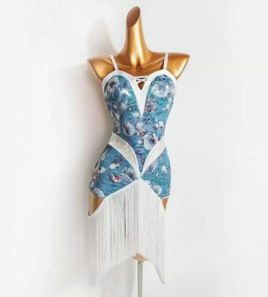 ダンスウェア ラテンダンス 舞台 発表会 ダンス衣装 社交ダンス 社交ダンス衣装 ラテンワンピースドレス 花柄 ブルー オーダーメイド