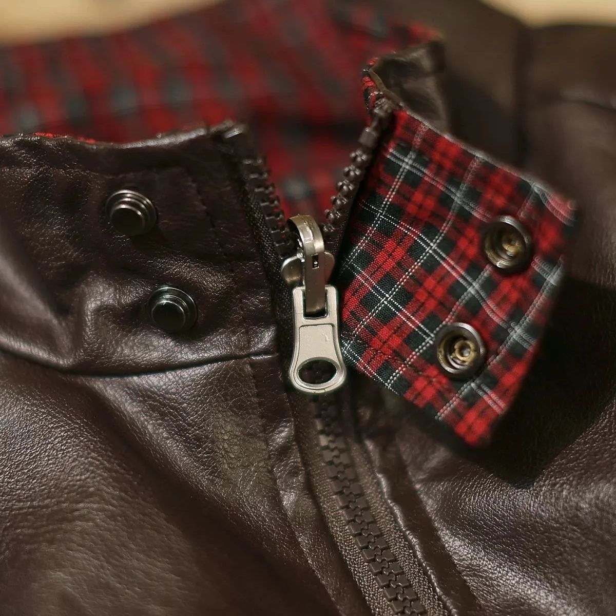 h 秋季 |ユニセックス 両面着用 ヴィンテージ風 ハリントン ジャケット フェイクレザー × 配色チェック|ワイドシルエット|バイカースタイル