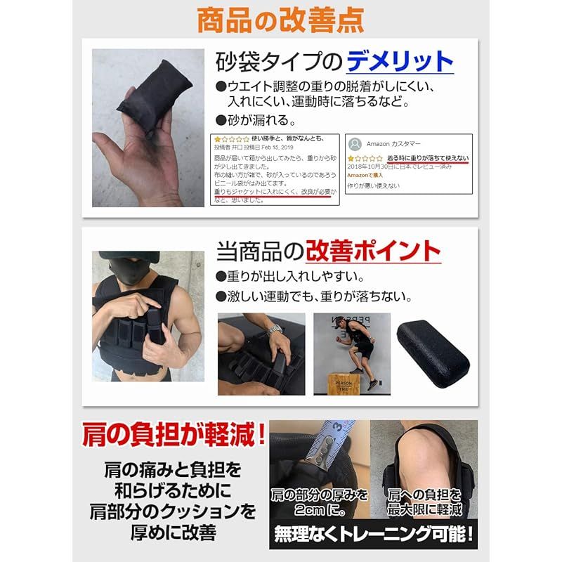 【旧ウエイトベストを徹底改善】チープな筋トレジャケットの砂漏れや重り脱着の煩わしさを改善するために重りは ブロックタイプを採用。ウエイトはポケットに固定され激しい動きの時もはずれにくくなりました。 肩への負担を軽減するために肩部分の厚みを2の厚みを持たせました。 ストレスなくトレーニング出来ます。