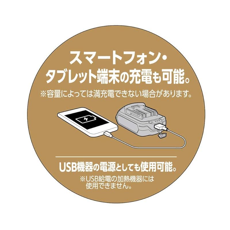 電池種類:リチウムイオン電池、電圧:18V、容量:2.0Ah、USB出力電圧:DC5V、USB出力電流:1A、充電時間:約60分