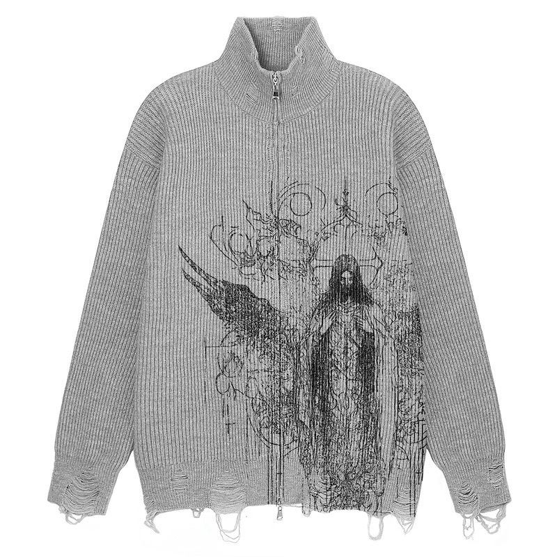 h アメリカンハイストリート 人物プリント ハーフハイネック ニットカーディガン|メンズ 秋冬 ヴィンテージ風 ダメージ加工 ジップアップ セーター