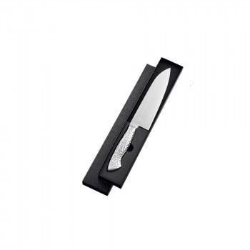 刃物の命ともいえる刃研ぎは、受け継がれてきた伝統技法による手仕事。職人が長年の経験を元に時間をかけてじっくり研ぎ上げ、鮮烈な切れ味を生み出しています。ハンドルは、気品ある槌目模様、深みある銀の色調。変則的な打痕が美しい陰影を生み出す印象的なデザインです。槌目の上に滑りにくい加工を施し、手に吸い付くような感覚と握りやすさを実現。さらに中を空洞にしたモナカ柄にする事で長時間使っても疲れにくい構造です。