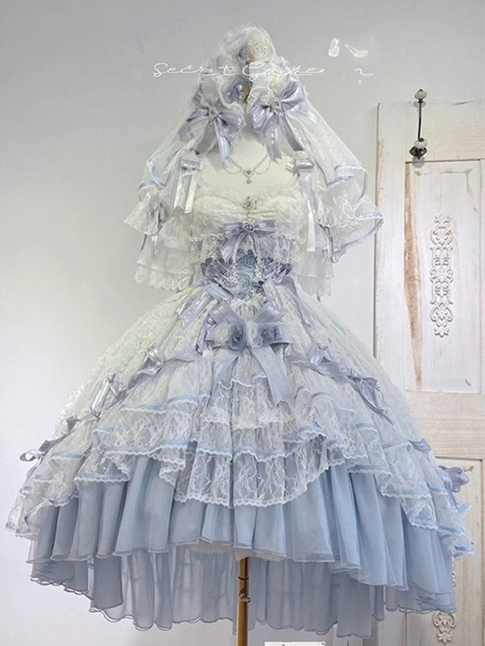 ロリータドレス ロング ワンピース 豪華レース 姫系 Lolita ウェディング風 ロマンチック フォーマル イベント ピンク ブルー コスプレ ロリータ 仮装 コスチューム 衣装 コーディネート パーティ ステージ