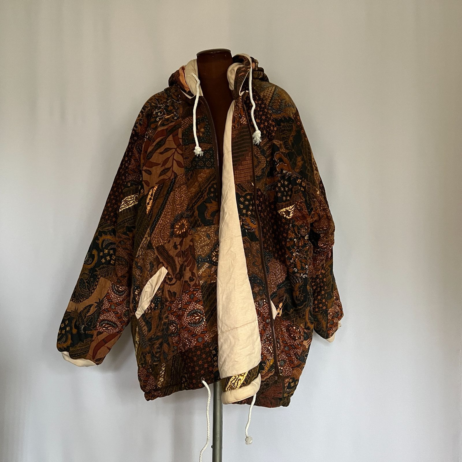 存在感のある幾何学模様のパッチワークが目を引く、厚手のヴィンテージジップパーカー。