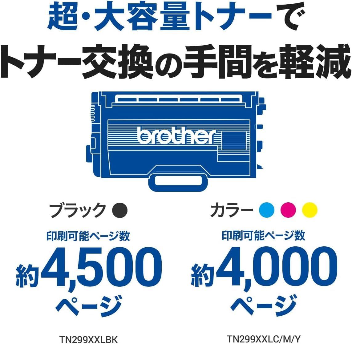 ●モノクロ約4500ページ、カラー約4000ページ印刷可能な超・大容量トナー対応でトナー交換の手間を軽減。トナーカートリッジ廃棄量の削減にもつながります●7年間の高耐久で本体寿命が長く、買替えの手間を軽減●給紙・排紙・トナー交換などの操作を前面から行うことができます。省スペース設計なので本体の場所を取りません●トナーとドラムを別々に交換することができる分離型を採用。両方の部品を無駄なく使いきることができるため、環境負荷も軽減●安定・高速通信であるWi-Fi5GHzにも対応。Bluetooth対応機器や他の電化製品で使用するWi-Fi2.4GHzとの干渉が起きにくく、安定した高速通信が実現●プリント/コピー/スキャン/ファクス対応●カラータッチパネル液晶:3.5型●標準用紙トレイ:1段(最大250枚)●多目的トレイ:最大30枚●ADF(自動原稿送り装置):最大50枚●印刷速度:カラー/モノクロ約30枚/分●自動両面プリント対応●両面同時スキャン対応●搭載メモリ:512MB●インターフェイス:USB/有線LAN/無線LAN●Wi-Fi Direct対応●対応消耗品:TN299C/TN299M/TN299Y/TN299XLC/TN299XLM/TN299XLY/TN299XLBK/TN299XXLC/TN299XXLM/TN299XXLY/TN299XXLBK/DR299CL/DR299CL 4PK/WT229CL/BU229CL