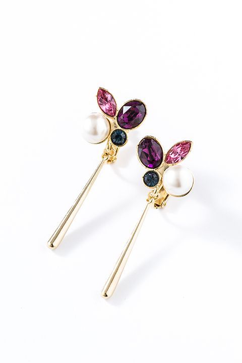 リオンの衣装の色味を落とし込んだピンク×パープル×ブルーのビジューが輝き、エンドパーツが揺れるデザインが目を惹くキュートなアクセサリー。