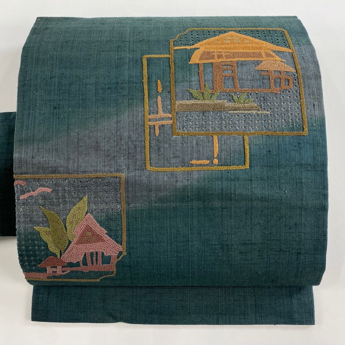 名古屋帯 秀品 家屋 破れ色紙 刺繍 深緑 正絹