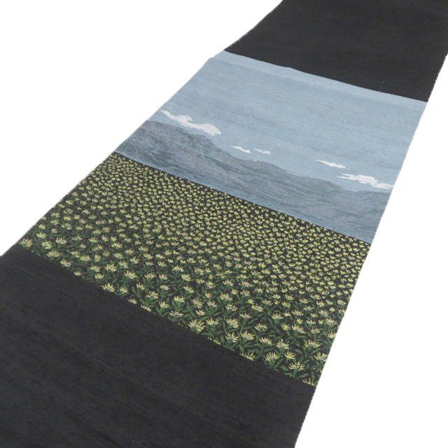 特選 京袋帯 名古屋帯 なごや帯 正絹 紬地 カジュアル 仕立て上がり 新田織物 風景 遠山 花 黒色 藍鼠色 多色 きもの北條 A 1276-14
