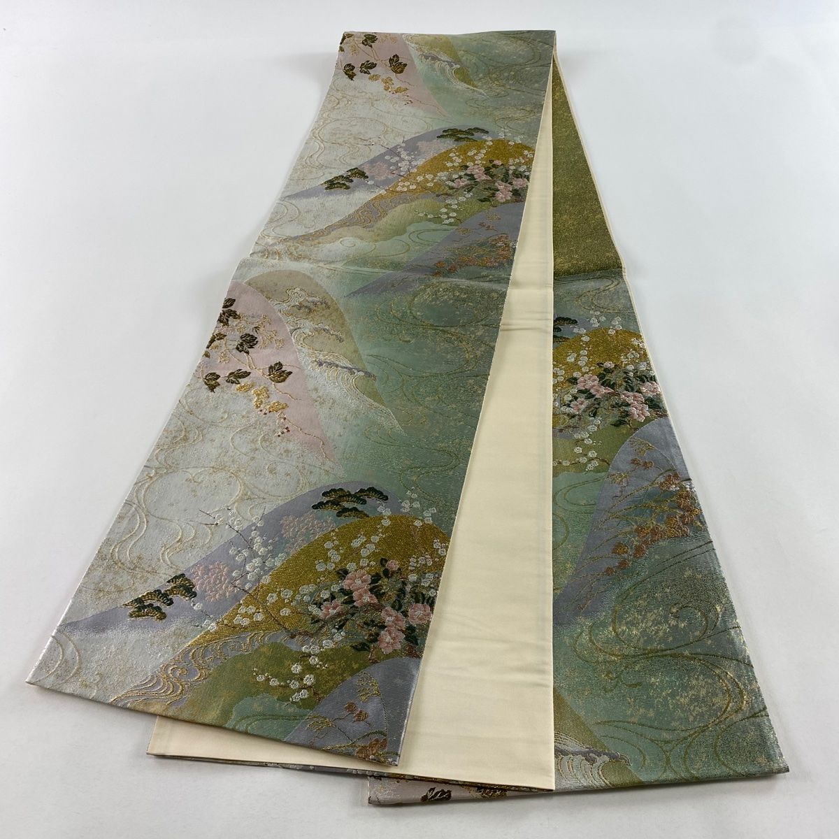 袋帯 秀品 琳派遠山四季文 箔 唐織 灰緑 六通 正絹