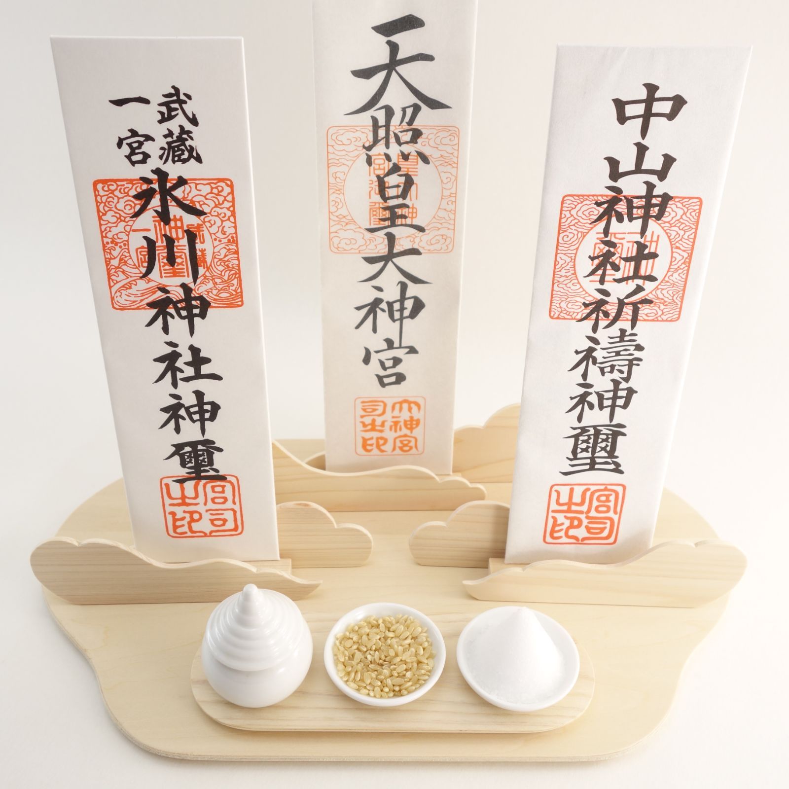 水、米、塩をお供えできる神具3点が付属されていますので、すぐにお祀りすることが出来ます。