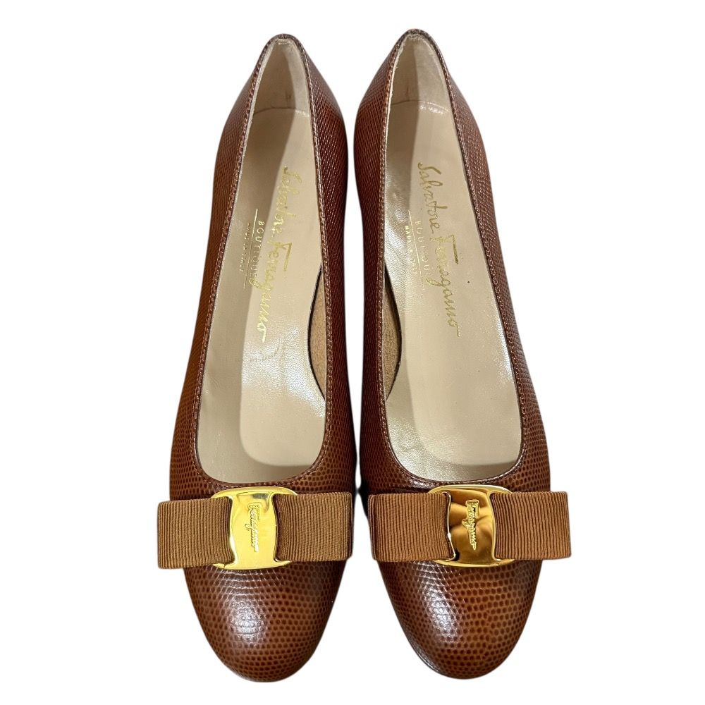 【商品名】Salvatore Ferragamo サルヴァトーレフェラガモ リザード型押し ヴァラリボン ローヒール パンプス 6 1/2 約23.5cm ブラウン
