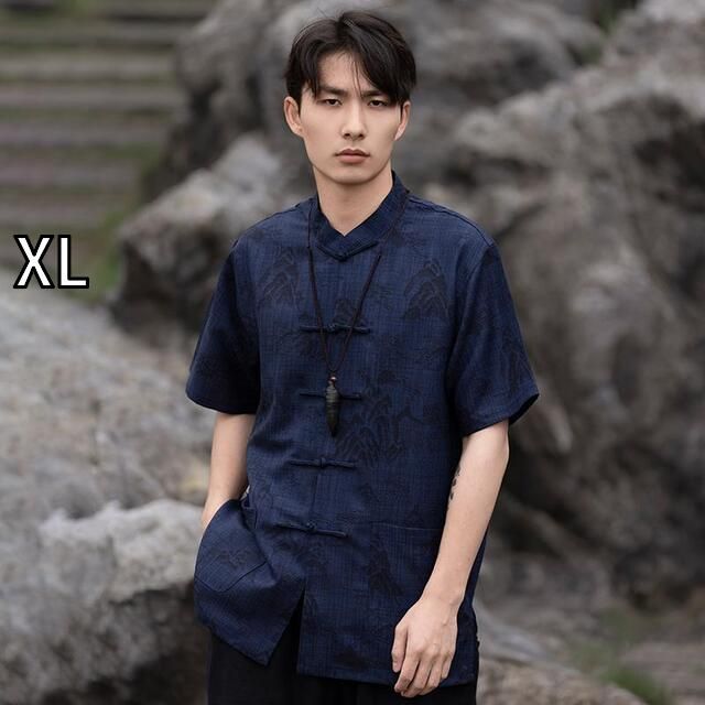 XL メンズ ファッション 服 男性用 オシャレ シンプル 大人 かっこいい 大きいサイズ ストリート 紳士服 夏 スタイル トップス スタンドカラー ボタン 半袖 シャツ プリントチュニック スーツ カンフー 唐