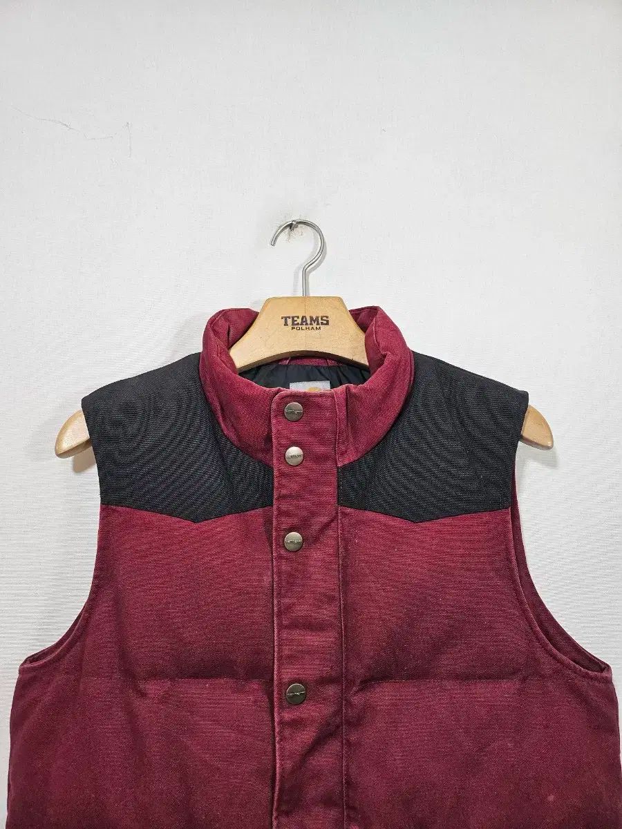 これはCarhartt (カーハート) ダウンベストです。バーガンディカラーで、ブラックのショルダーデザインがアクセントになっています。カーハートのロゴもチェックしてください!全体的に、別途問題ありません。それ以上のコメント (※メルカリshop取引では対象外、Mercari窓口まで要連絡) はありません。すぐに安全な支払いを行ってください