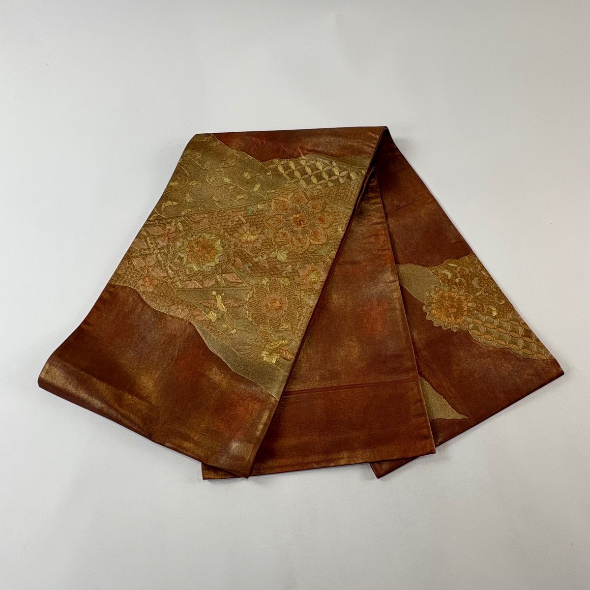 袋帯 秀品 華文 花唐草 金糸 金彩 赤茶 お太鼓柄 正絹