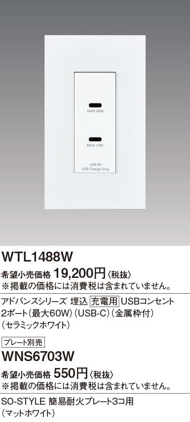 パナソニック (Panasonic) 埋込充電用USBコンセント アドバンスシリーズ 金属枠付 USB-C 60W 2ポート セラミックホワイト 幅48.4×奥行44×高さ110mm WTL1488W