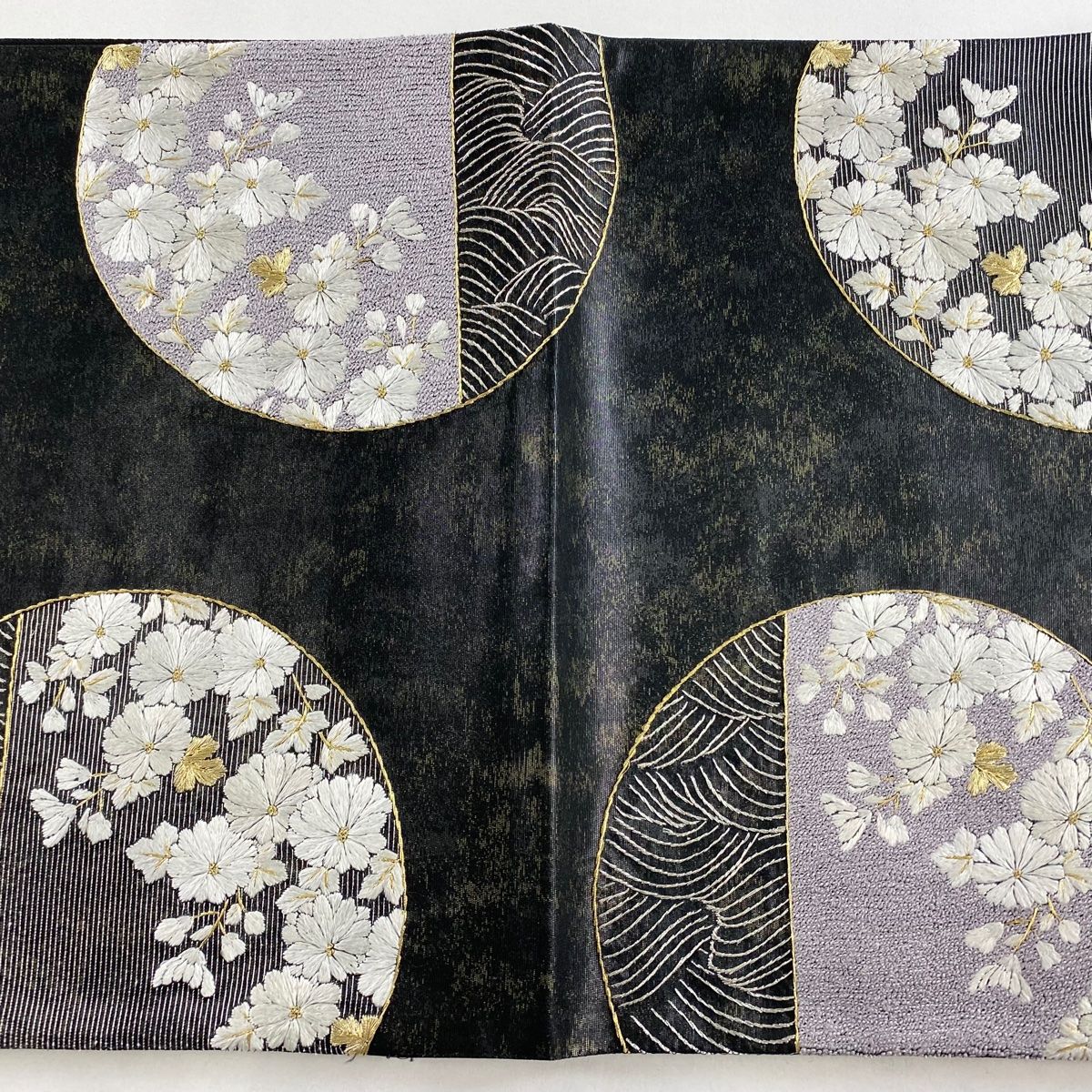 袋帯 草花 波 刺繍 金銀糸 黒 お太鼓柄 正絹