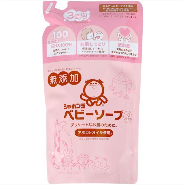 シャボン玉ベビーソープ泡タイプはたっぷり3倍泡(当社比)にリニューアルします。たっぷりの泡で「手のひら洗い」しやすく、ワンプッシュで赤ちゃんの全身を洗えます。低刺激で保湿性に優れたアボカドオイルをカリ石ケン素地の原料に使用した、香料・着色料・酸化防止剤・合成界面活性剤を不使用の無添加石けんです。泡切れに優れスッキリと洗い流せて、天然の保湿成分でしっとりすべすべ。赤ちゃんの肌を健やかに保ちます。