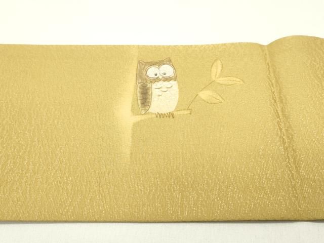 平和屋着物 九寸名古屋帯 手描き 梟 枝葉文 黄朽葉色 さが美扱い 正絹 ob