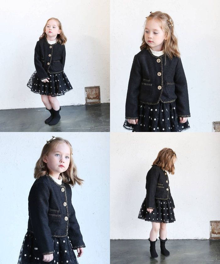 デイリーのシンプルさにフォーマルのエレガンスを加え、子供たちの自己表現を高めるツイードジャケット。