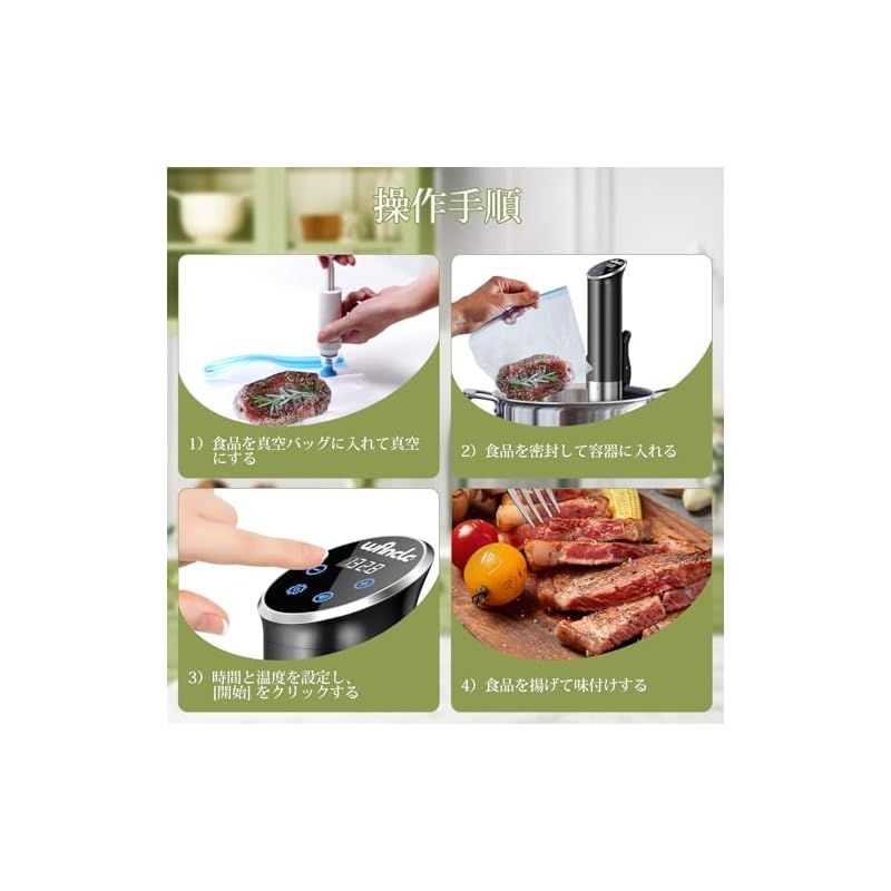 この低温調理器は、優れた調理体験を提供するだけでなく、さまざまなキッチン環境や調理ニーズに対応します。革新的なテクノロジーで、ユーザーに健康的で美味しく、ストレスフリーな調理体験を提供することを目指しており、家庭のシェフにとって理想的な選択肢です。