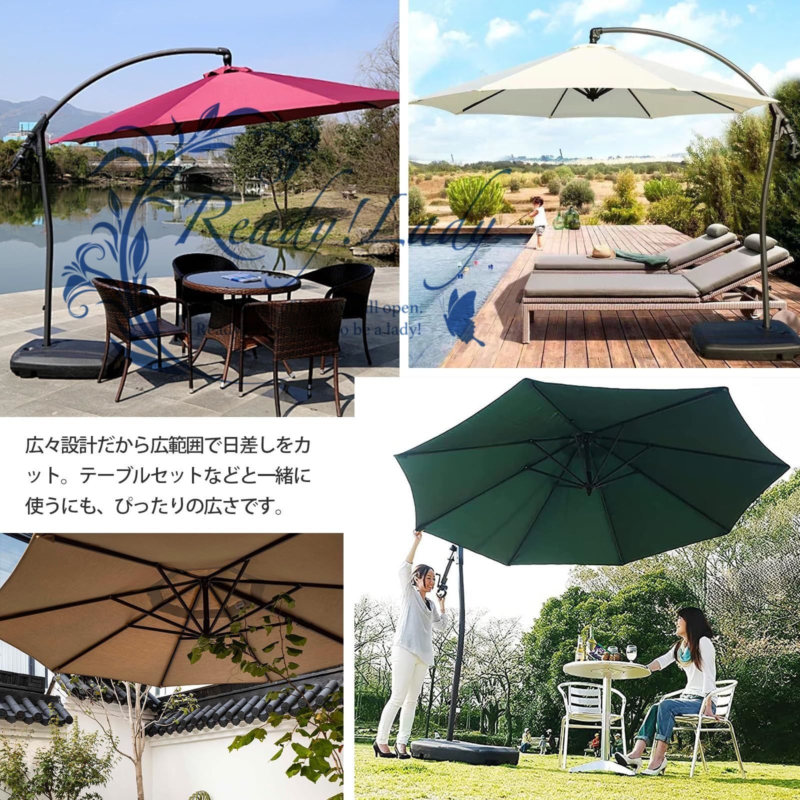 大型ガーデンパラソル 直径300 cm UVカット 撥水 風に強いアルミ製ハンギングパラソル 日除け傘カバー&水タンクベース付き 庭園 中庭 テラス用