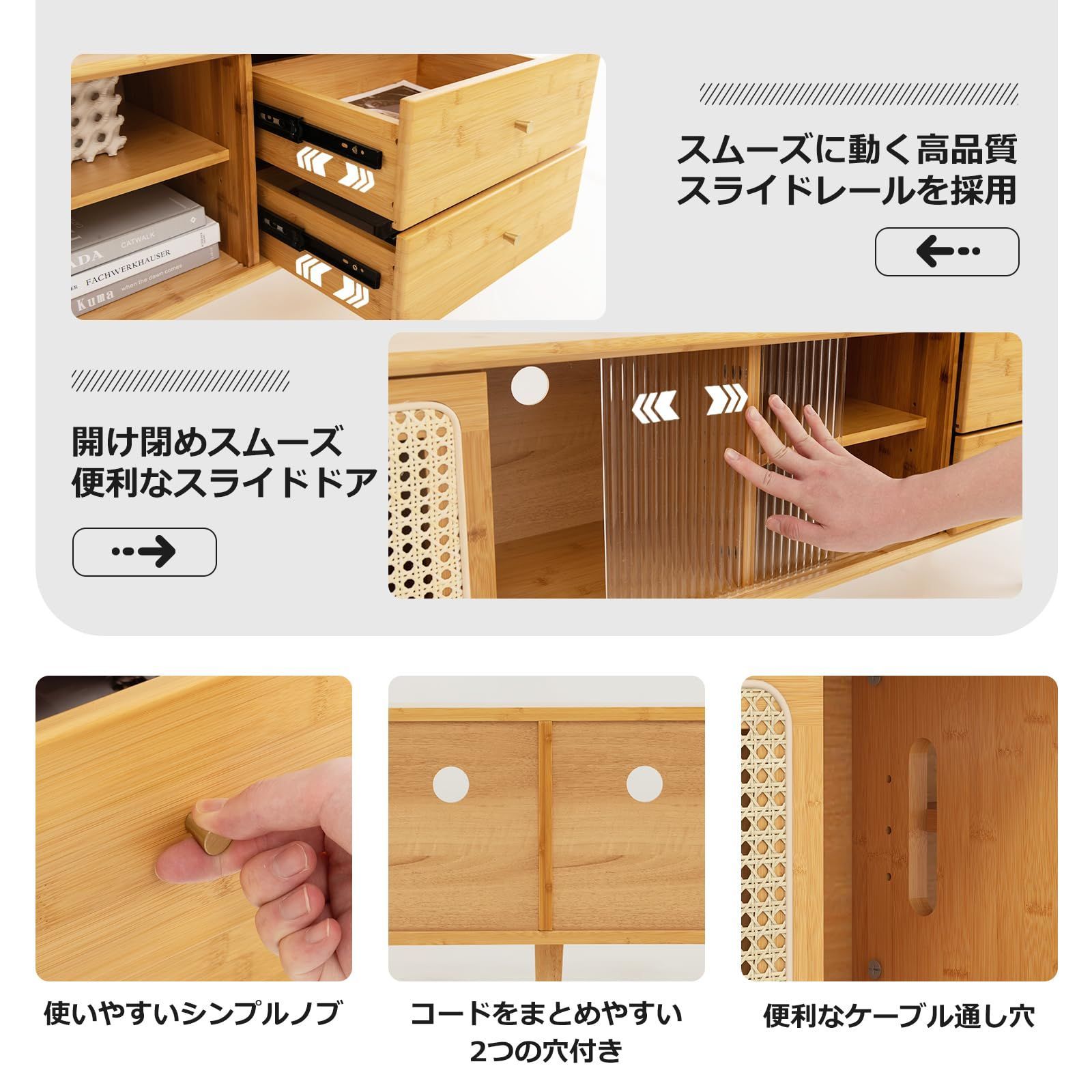 【65型まで対応】●本体サイズ:幅140x奥行31x高さ45.5cm●天板の耐荷重:70kg●素材:天然竹、PEラタン、ガラス●本体重量:21kg