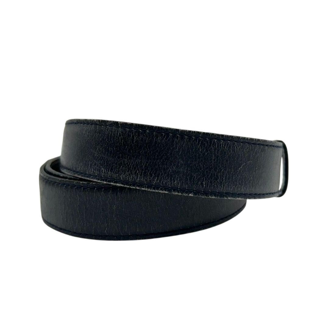 上質なレザーにネイビーの深みが映えるロエベのベルト。アナグラムの存在感とゴールド金具のコントラストが装いを格上げし、ビジネスからドレスアップまで幅広いシーンで活躍します。2.4cm幅でウエストにすっきり収まり、スマートな印象に仕上げます。
