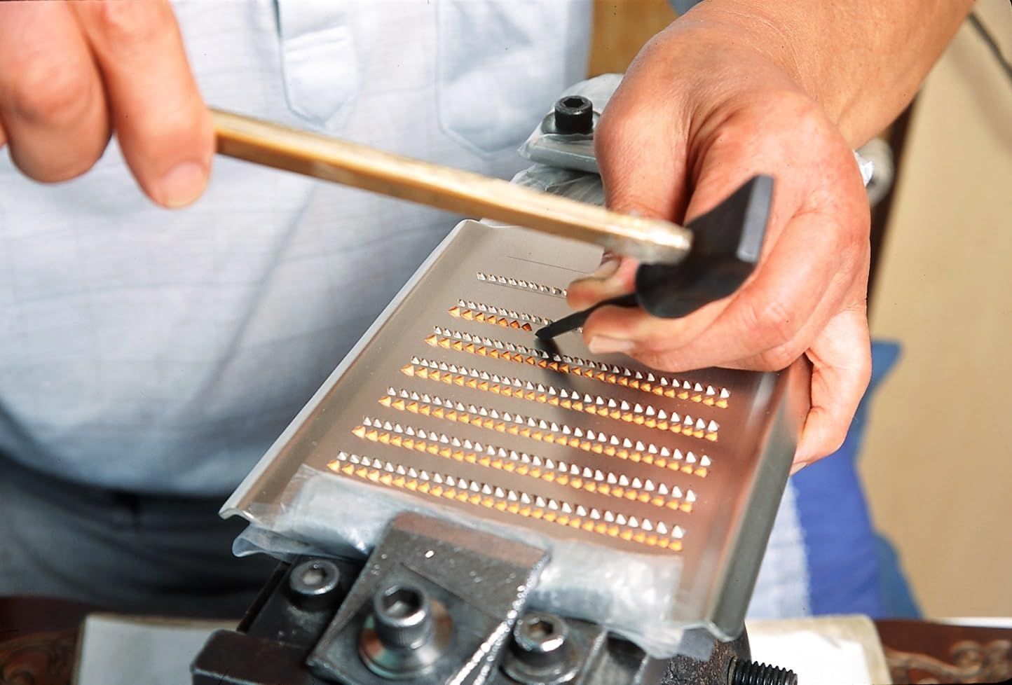 機械の目立てと違い、伝統工芸である特殊彫金技術で一目ずつ手で立てられたおろし金。だからバツグンの切れ味を誇り、繊維と水分を分離させずおろせるので栄養を損なわず、本当に美味しいおろしを味わえるのです。そしておろしの素材は「銅」。銅の金属イオン(銅イオン効果)は、あの病原性大腸菌O-157をも死滅させるほどの除菌・抗菌力を持ちますので、衛生的で安心です。