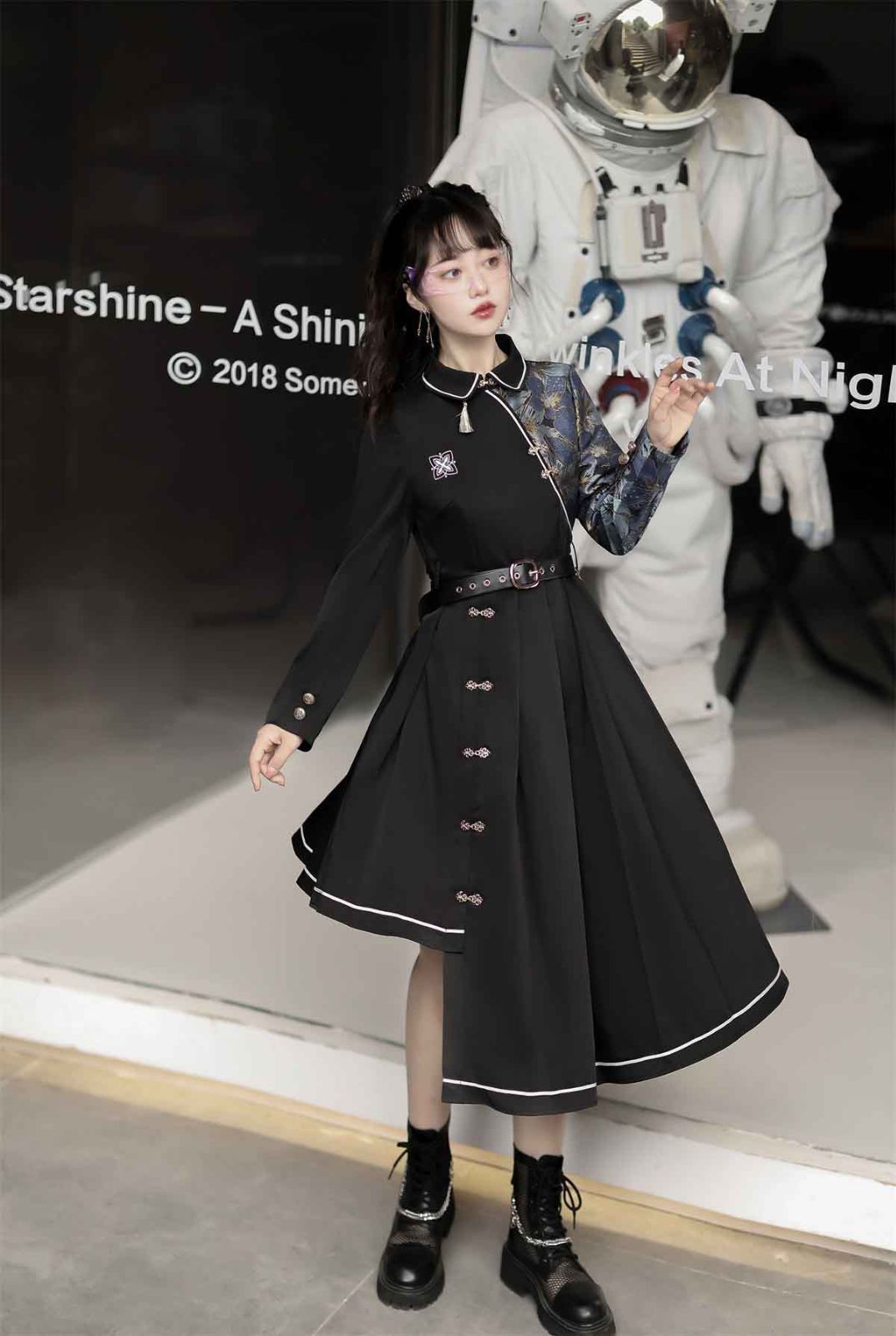 チャイナ風ワンピース 半袖 長袖 ミモレ丈 中国風 シャツワンピース ベルト付き 暗黒系 改良 チャイナドレス 花柄切り替え 不規則裾 プリーツスカート 中華 ゴスロリ ロリータ ワンピース 中華ドレス S M L