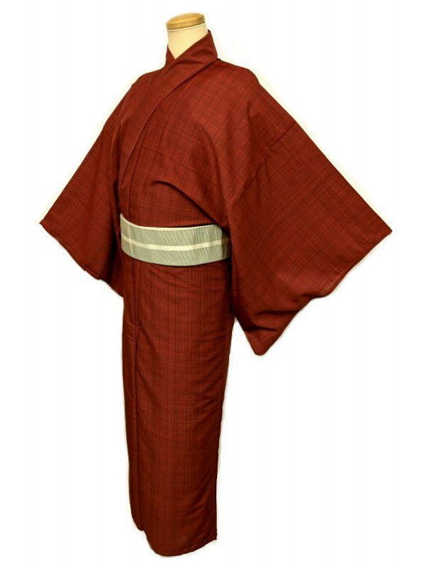 浴衣 男物 化繊 赤色地に格子模様 裄72 LLサイズ 吸湿速乾 防シワ ポリエステルゆかた シーズン夏