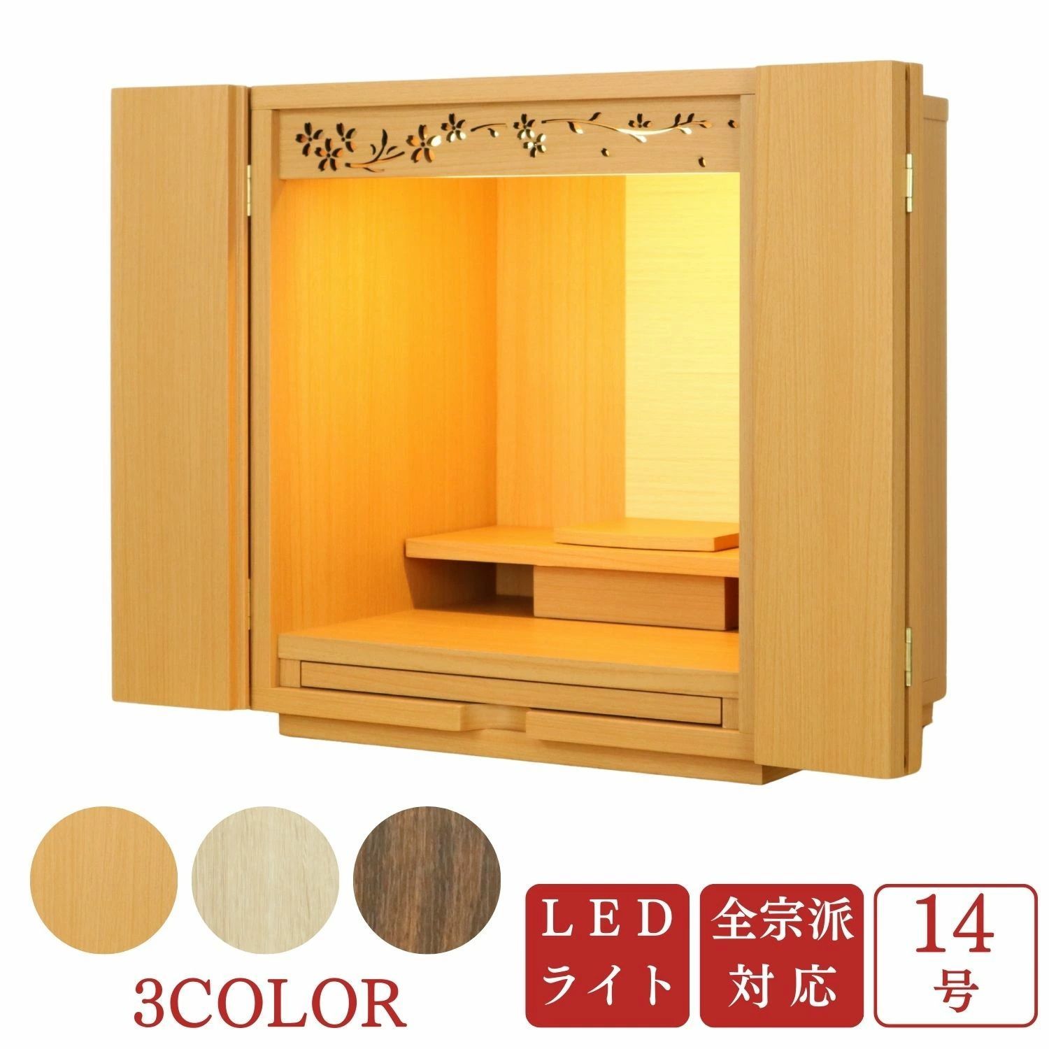 モダン仏壇 14号 桜透かし欄間 高さ42×幅36×奥行き30 cm 3カラー 桜調 ナチュラル調 ウォールナット調 デザイン おしゃれ シンプル 家具調 インテリア仏壇 お彼岸 お盆 迎え火
