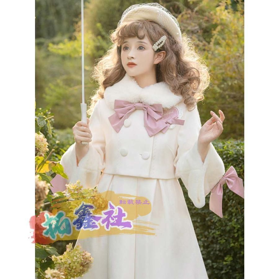 ステンカラーコート ロリータ 冬服 ファー リボン レディース ジャケット ミディアムコート コート ロリータコート オフホワイト トップス アウター 可愛い 学生 通学 通勤 着〓せ 女の子 長袖 袖あり 秋 冬 衣装 S M L dd290c0c0m3