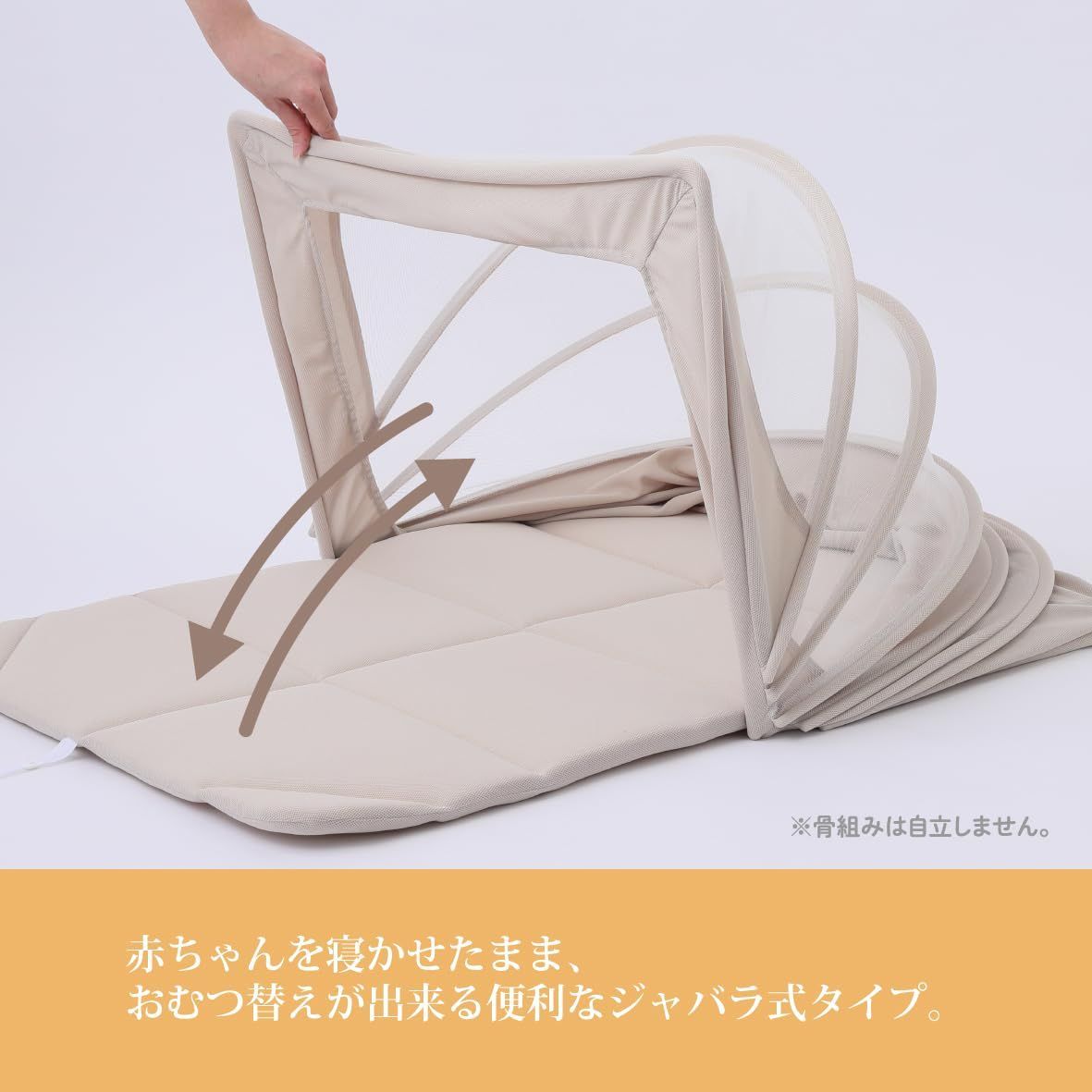 お昼寝用の折り畳みドーム型ベビーベッド。蛍光灯の光や騒音、クーラーや扇風機の風を軽減。閉めて使うことで、赤ちゃんを虫やホコリから防ぎます。