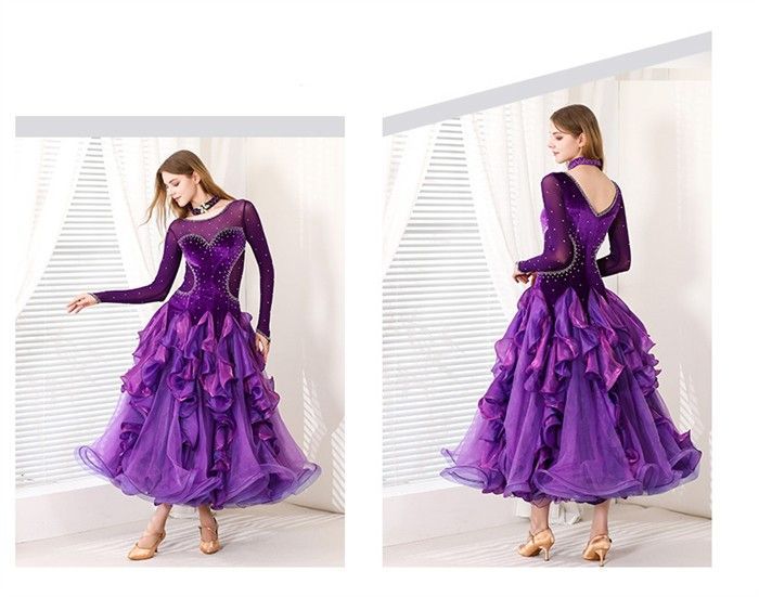 社交ダンスドレス モダンドレス パープル 社交ダンス衣装 社交ダンス ドレス 衣装 長袖 大きい裾 ワルツダンス ステージ衣装 ダンス衣装 ダンスウェア 競技会 パーティー 発表会 競技着 練習着 舞台 演奏会 演出