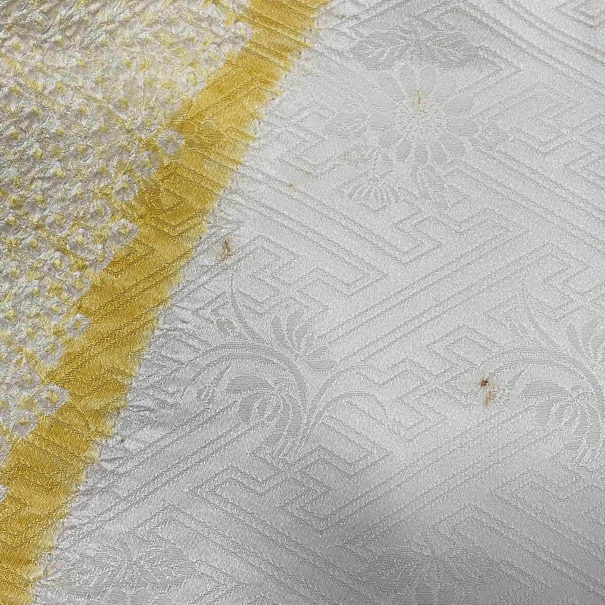八掛裾部分に薄汚れ、衿裏と胴裏に黄変がございます。