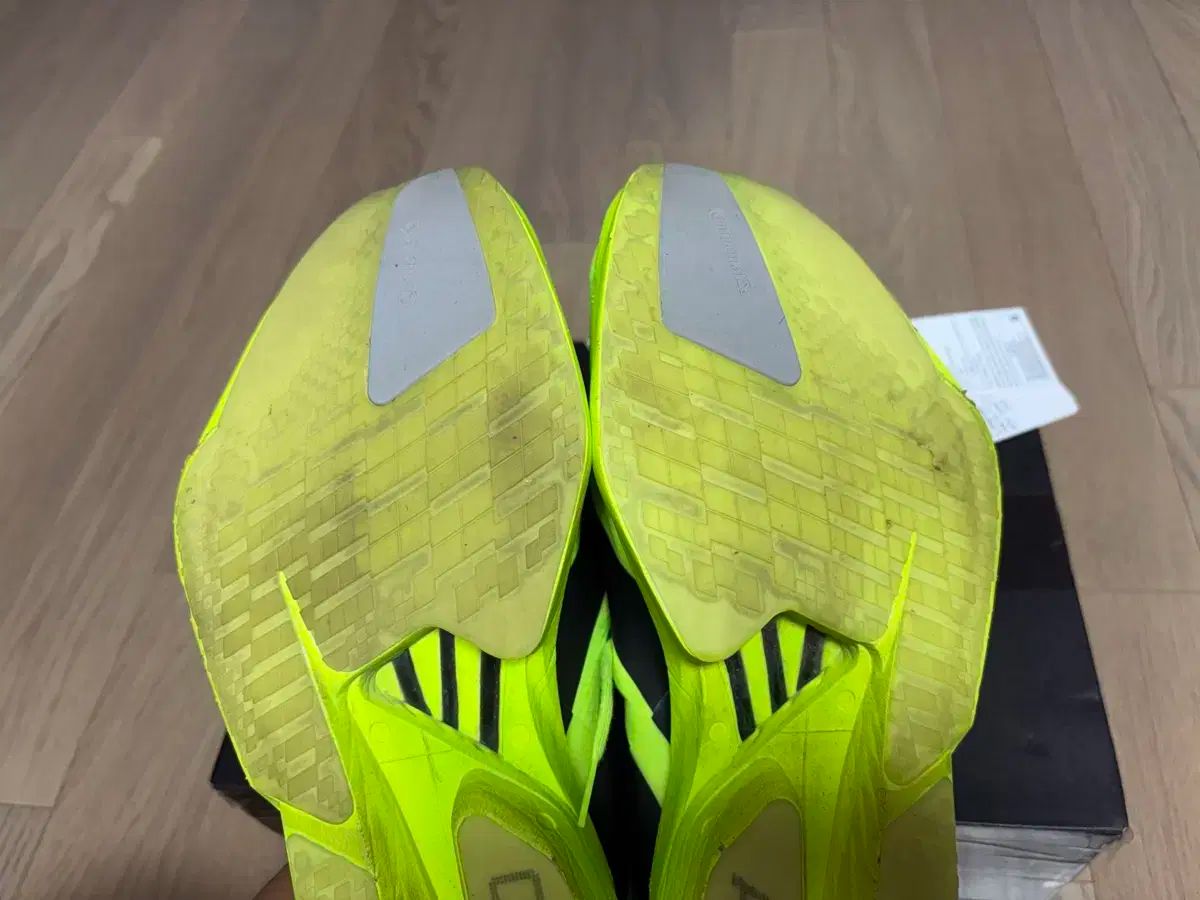アディダスアディゼロアディオスプロ4は蛍光カラーモデルです。タグ付きの新品アイテムで、フルボックスに入っています。サイズは285で、累積距離が50k未満と良好な状態です。