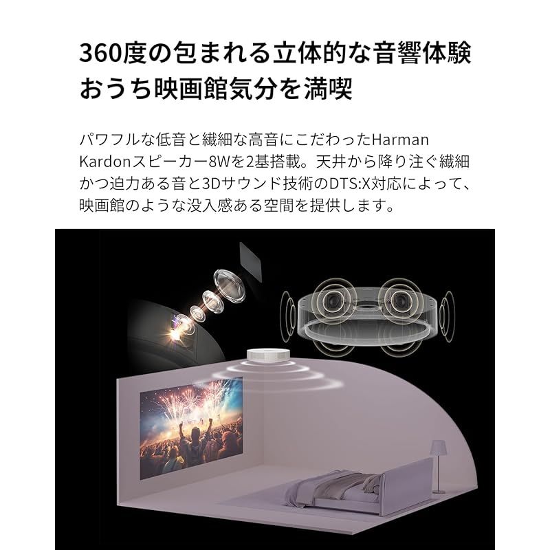 【充実のスペック】700 ANSIルーメンの輝度&フルHDの解像度のプロジェクター、Harman Kardon製の高性能スピーカー(8W x 2基)、そして10,000通りの調光・調色が可能なLEDライトといったハードウェア面、人気のエンタメ系VODサービスから多彩なオリジナルコンテンツ搭載のソフトウェア面など、それぞれに妥協のないこだわりを追求しました。