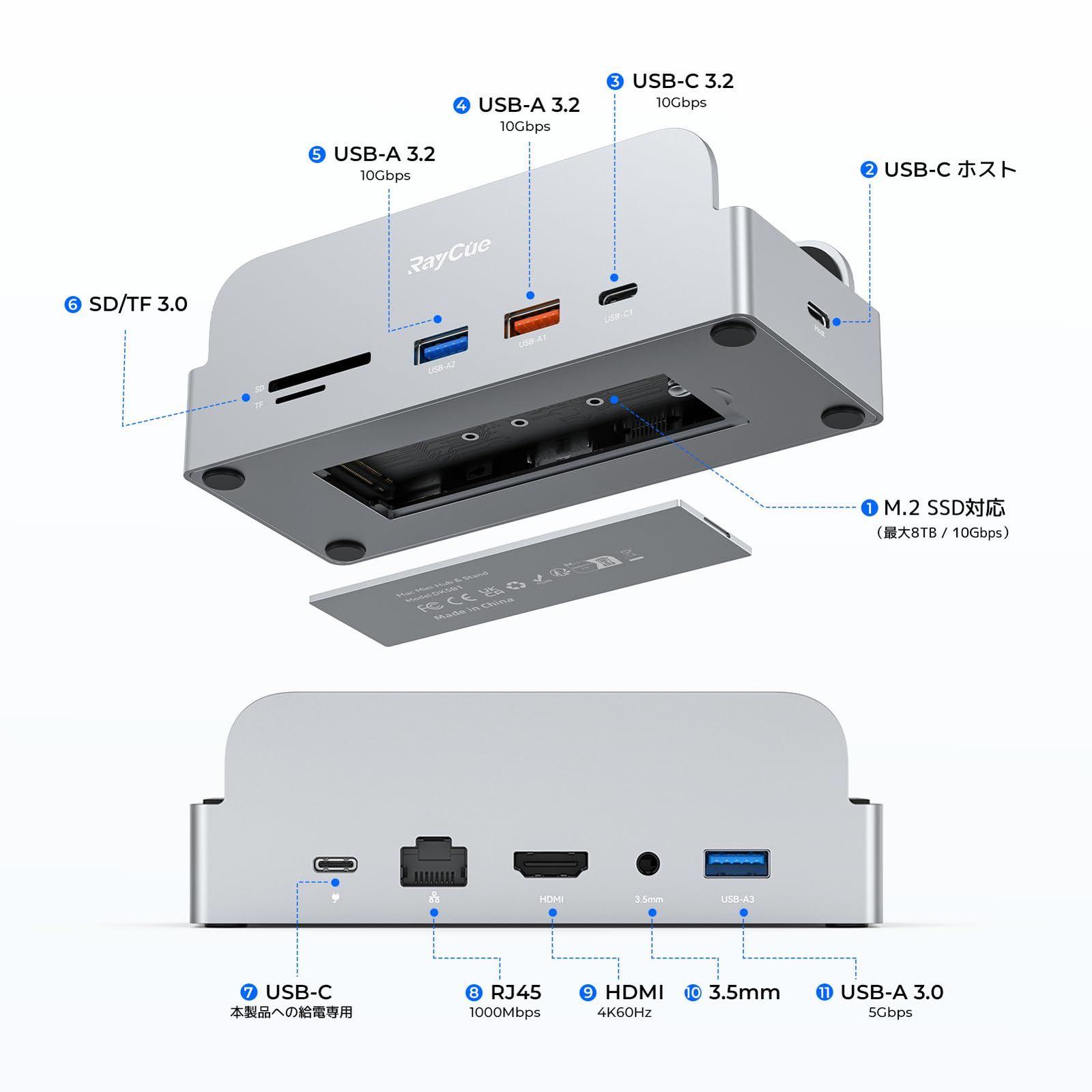 Mac Mini M4 対応ハブ M.2 NVMe SSD ケース付き|4K60Hz HDMI・USB3.2 10Gbps・SD/TFカードリーダー・10ポート・RJ45・高速拡張・高精細スクリーンUI Raycue