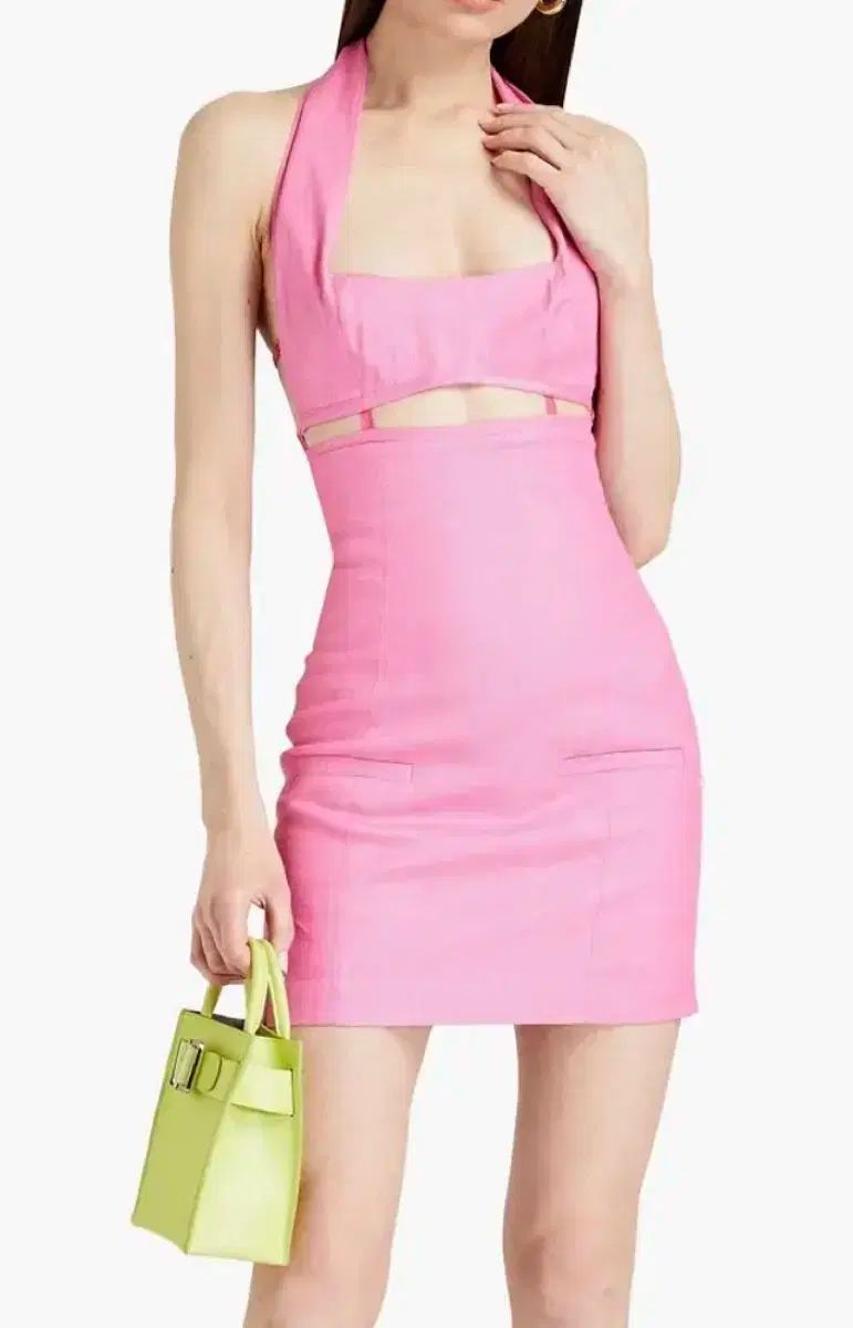 これはジャケムスリマオカットアウトミニドレスです。ホットピンク色とホルターネックデザインがユニークです。カットアウトのディテールでアクセントを付けてトレンディなルックスを演出できます。他に質問がない場合は、すぐに安全な支払いを行ってください!