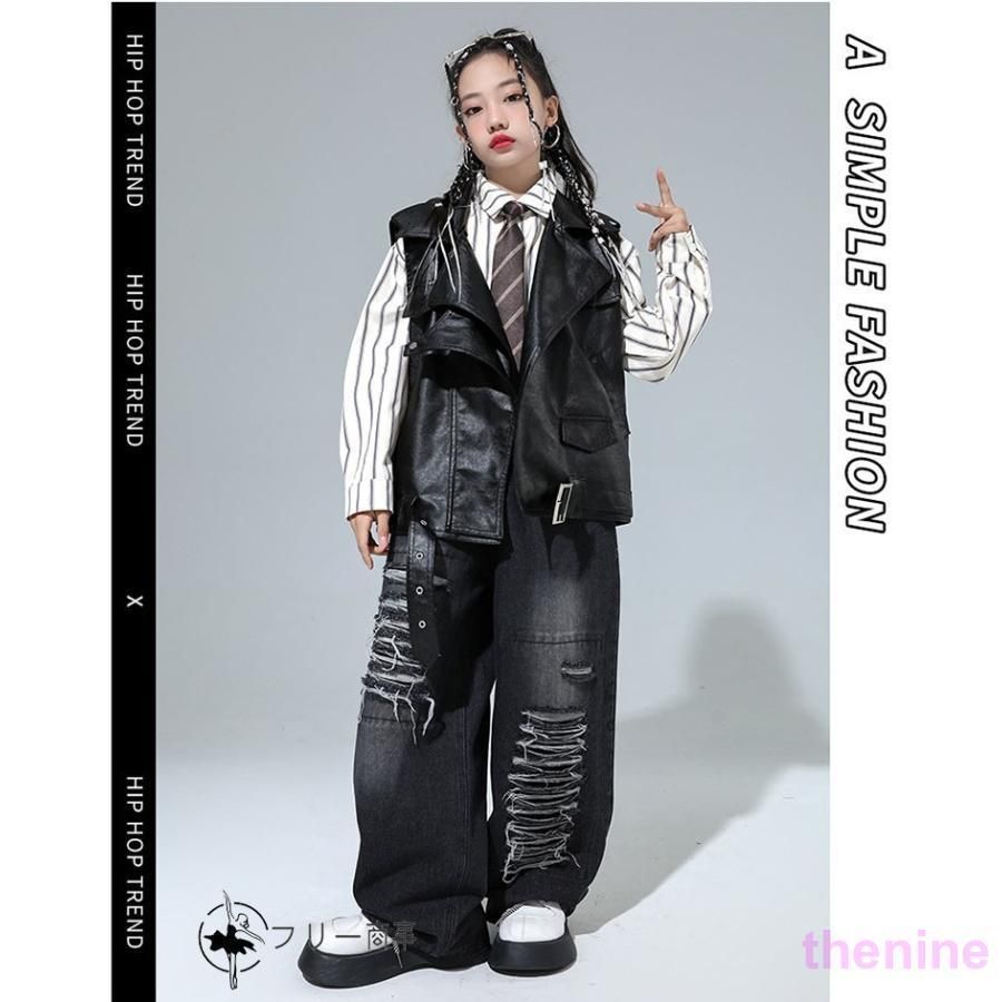 キッズ ダンス 衣装 セットアップ かっこいい レザーベスト デニムパンツ ダメージ パンツ 縞柄 シャツ 韓国 K-POP ジャズダンス ヒップホップ 男の2.25 LY 163