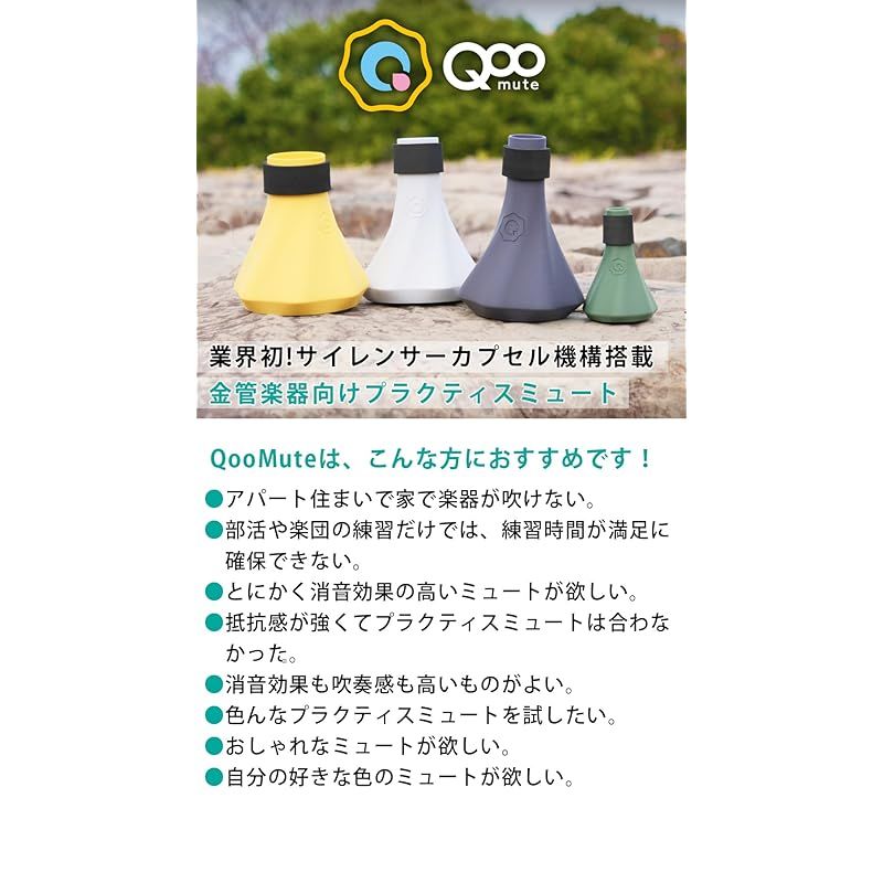 ■業界初!サイレンサーカプセル機構搭載 3種類のカプセル付け替えで、環境に合わせた消音機能で練習可能! ミュート底面に搭載されているアタッチメントにサイレンサーカプセルをつけることができます。 一眼レフカメラのレンズのようにQooMute(クウミュート)は常にあなたの練習環境に合ったプラクティスミュートに変化します。 ■消音特化カプセル 消音効果の高いタイプのカプセル、人の話声ぐらいまで静かにすることができます。 演奏時の抵抗感は強めですが、隣の部屋で練習しても注意しないと聴こえないほどの消音効果があります。 消音 ★★★★★ 吹奏感 ★★★☆☆ 音程 ★★★★☆ 音色 ★★★☆☆ ■吹奏感特化カプセル 演奏時の抵抗感を減らすことを追求したカプセル。 消音効果は控え目ですが、ミュートなしの吹奏感に近く、近隣を気にしなくてよいお昼の練習に最適です。 消音 ★★★☆☆ 吹奏感 ★★★★★ 音程 ★★★★☆ 音色 ★★★☆☆ ■音色特化カプセル カプセル内にスポンジを詰め、全ての音域において音色の変化を抑えることを追求したカプセル。 また、程よい抵抗感があり低音域の演奏がし易い特徴もあります。 消音 ★★★★☆ 吹奏感 ★★★★☆ 音程 ★★★☆☆ 音色 ★★★★★ 【カプセルの各パラメーターについて】 ●消音...音量をどのくらい抑えられるか ●吹奏感...ミュートを外した状態の吹き心地に近いかどうか、演奏時の抵抗感 ●音程...各倍音間のイントネーション(音程の幅がミュートを外した状態に近いかどうか)、音のツボのとらえやすさ ●音色...鳴りムラがないこと息の音やノイズが少ないこと、楽器本来の音色に近いかどうか 【音量参考値】 ミュート無し(オープン):78~105dB 消音特化カプセル:49~73dB 吹奏感特化カプセル:53~81dB 音色特化カプセル:50~77dB ※楽器から1.5mの位置で計測 ※実際に演奏している計測値なので、音量にムラがあります。 ※計測する距離や環境によっても計測値は変わりますのであくまで参考値です。