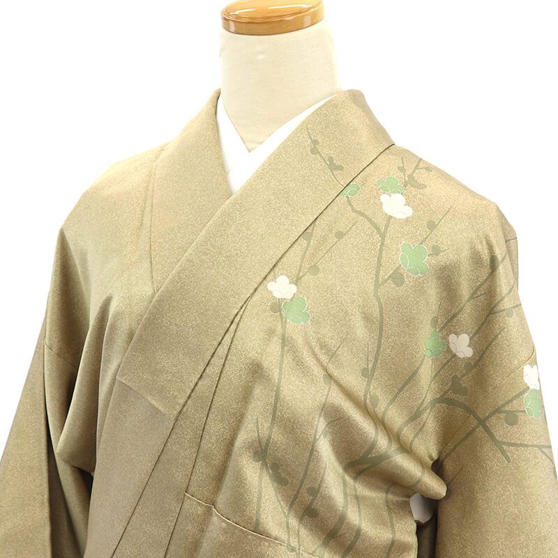 伝統工芸士中西進氏の訪問着。品のよい光沢のあるベージュに、渋めの金ですらりと伸びる梅の枝、一部刺繍を使い、梅の柄が表現された訪問着です。地色の薄い光沢が、程よい上品さを表現しております。薄緑と白の梅。裾には、茶深緑の深みのある色で、裾回りに重厚感があります。すっきりとした色使いで、シンプルながら使いですが、上品な美しい着姿をお楽しみいただけます。