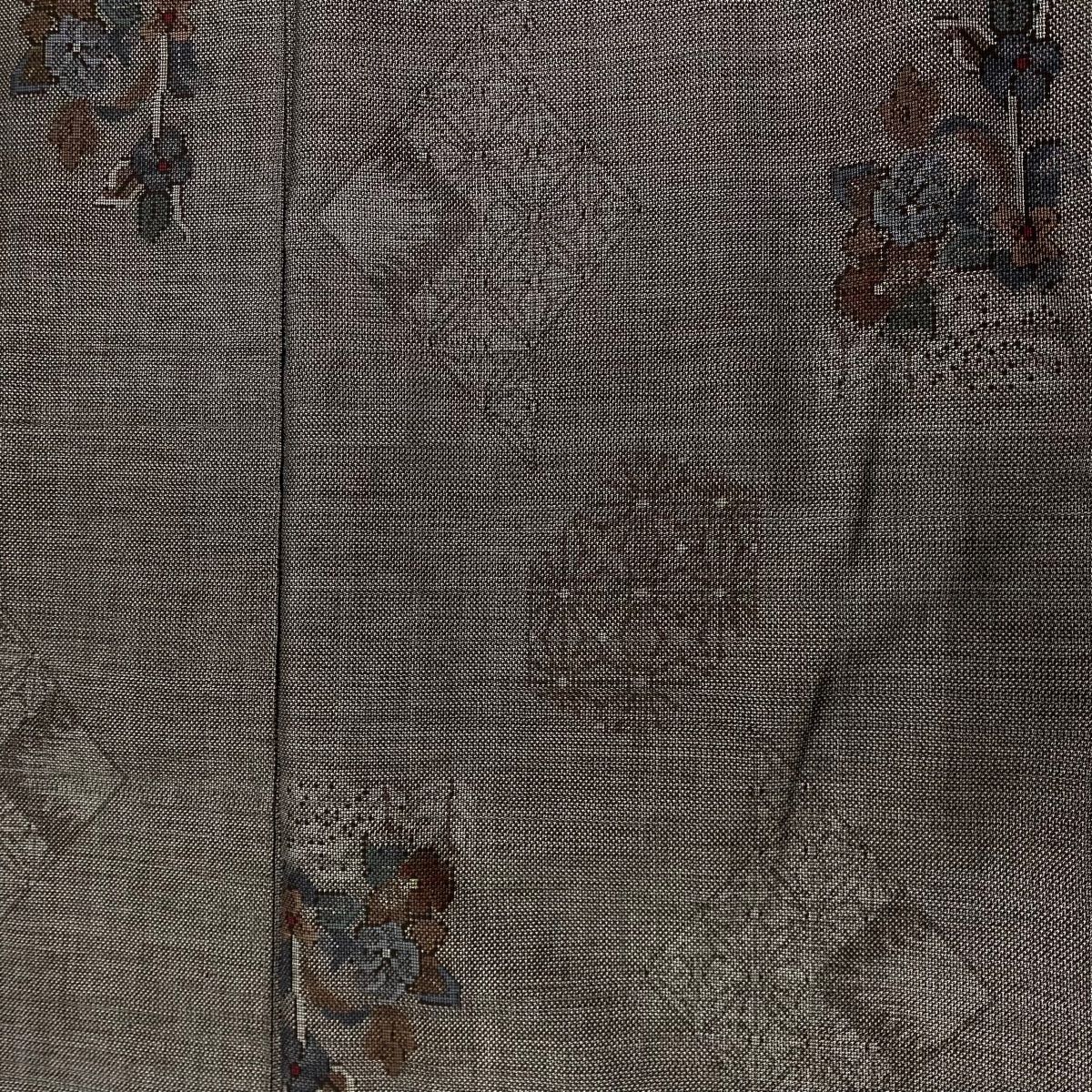 紬 身丈159 cm 裄丈67 M 袷 草花 麻の葉 灰茶 正絹