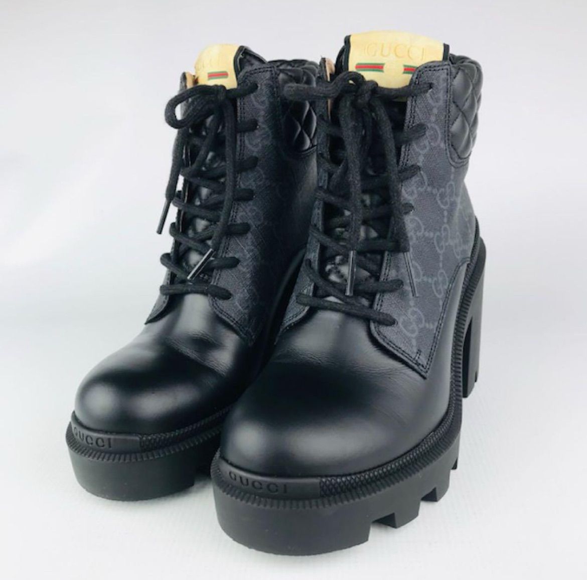 GUCCI グッチ スタイル GGスプリーム エンボス加工ブランドロゴ レザー切替し レースアップ ショートブーツ 35.5 イタリア製 ブーティ レディースブーツ ブーツ 秋冬物 カジュアル ブラック 靴 ブランド