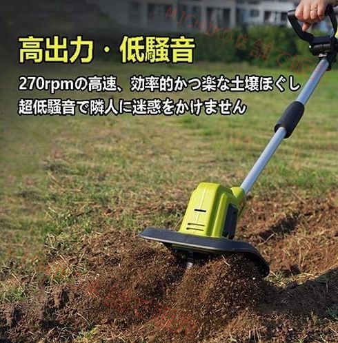 【仕様】サイズ:幅25×奥行22×高さ159cm 重量:約6.7kg 耕幅:25cm 耕深:22cm 電圧:20V 回転数:270rpm 充電時間:2~3 時間 使用時間:約1時間 バッテリー容量:4.0Ah 付属品:バッテリー、充電器。
